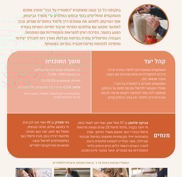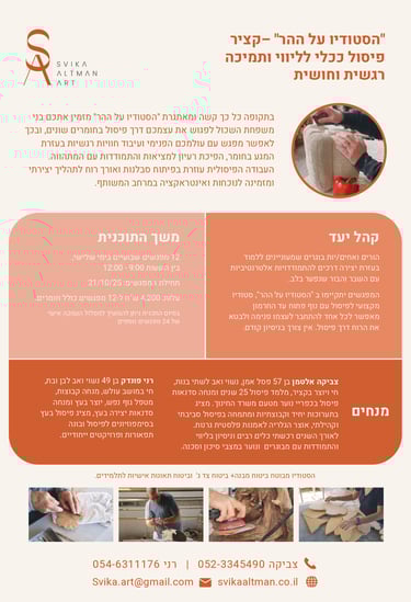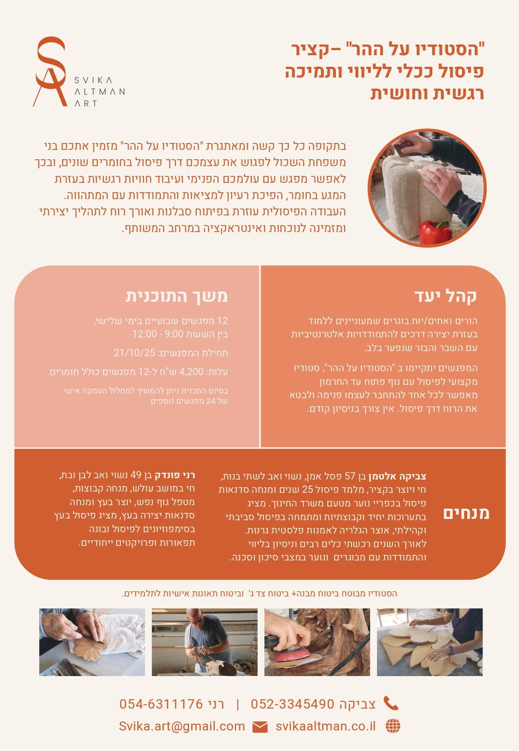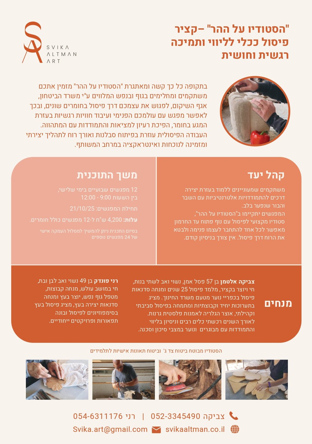 בתקופה כל כך קשה ומאתגרת "הסטודיו על ההר" מזמין אתכם משפחות השכול, משתקמים ומחלימים בגוף ובנפש לפגוש את עצמכם דרך פיסול בחומרים שונים, ובכך לאפשר מפגש עם עולמכם הפנימי ועיבוד חוויות רגשיות בעזרת המגע בחומר, הפיכת רעיון למציאות והתמודדות עם המתהווה. העבודה הפיסולית עוזרת בפיתוח סבלנות ואורך רוח לתהליך יצירתי ומזמינה לנוכחות ואינטראקציה במרחב המשותף.